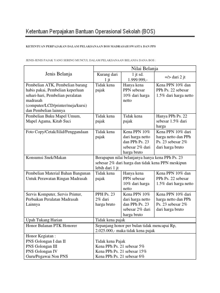 Dia sangat menyayangkan dengan kebijakan seperti ini. PPh pasal 23 Merupakan pajak yang dipotong atas penghasilan dari jasa. Komponen penggunaan dana BOS Reguler lihat pada pasal 12 dst.